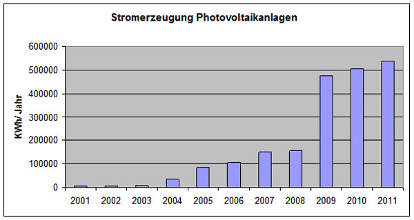 Auch hier liefert der Ort einen Beitrag zur CO2 neutralen Energieerzeugung, der deutlich über dem Durchschnitt vergleichbarer Gemeinden liegt. Waren es anfangs noch Idealisten, die symbolische Anlagen installierten, hat sich die Produktion in den letzten drei Jahren zu einem Niveau entwickelt, welches uns allein aus Photovoltaikstrom zum Selbstversorger gemacht hat.